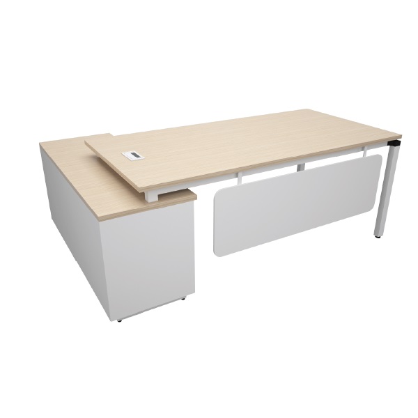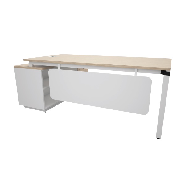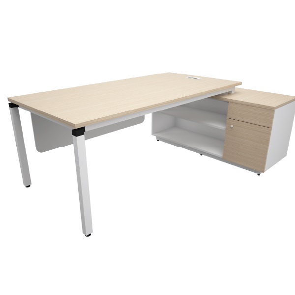 Kiểu dáng: Khung chân làm bằng thép hộp NK, sơn bột tĩnh điện màu trắng ngà, cơ cấu liên kết bằng nhôm đúc nguyên khối, sơn bột tĩnh điện màu đen. Chân bàn sử dụng nút chân nhựa tăng chỉnh chiều cao, một đầu bàn được bắt cố định vào hộc. Bàn sử dụng linh kiện Hafele.