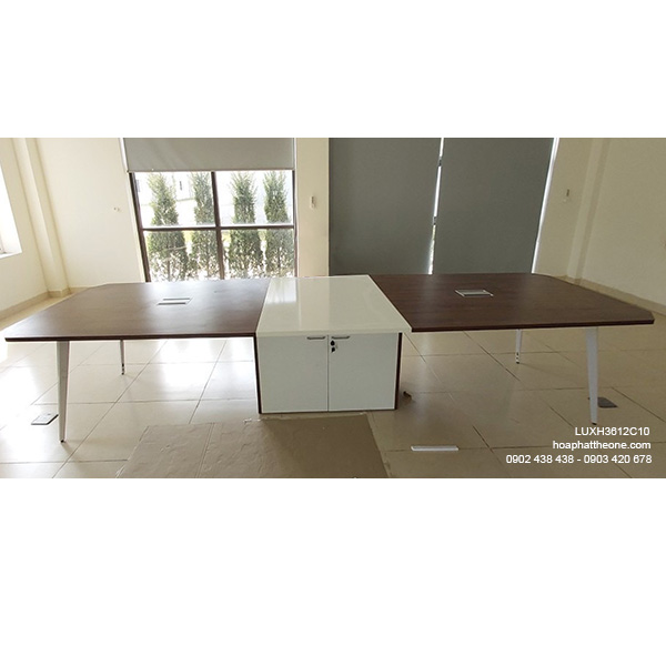 | Kiểu Dáng | Bàn họp mặt chữ nhật phối màu, 4 góc vát chéo. Chân sắt tấm gấp kiểu C10 sơn tĩnh điện trắng. Bàn có tủ để đồ phối màu trắng. |