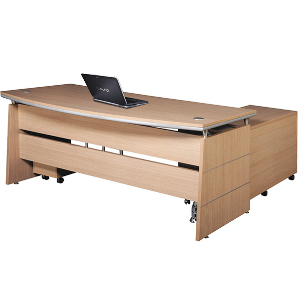 Các mẫu bàn trưởng phòng phổ biến thường đi kèm với tủ phụ và hộc tủ. Chúng được chế tạo từ gỗ công nghiệp kết hợp với trụ inox và có yếm tôn treo lửng hoặc yếm gỗ sát đất.
