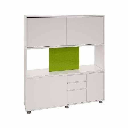 Kiểu dáng: Tủ sử dụng được 2 mặt, có 3 khoang. Khoang trên là cánh lùa, khoang giữa trống, không cánh, được thiết kế 1 tấm gỗ bọc nỉ xanh 2 mặt chính giữa. Khoang dưới có cánh lùa, hộc 3 ngăn kéo và 1 cánh mở.