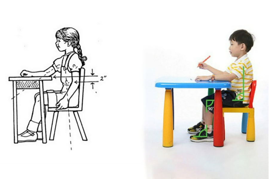 - Chiều cao bàn ghế: Bàn ghế phải được điều chỉnh sao cho chiều cao mặt bàn ngang tầm ngực trẻ, chiều cao ghế ngang tầm đùi trẻ. Khi ngồi, trẻ có thể đặt chân thoải mái dưới sàn, đầu và lưng thẳng, hai vai thả lỏng.